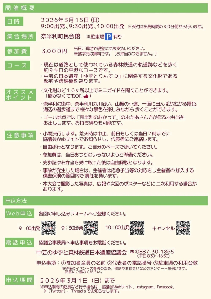 ◇Web申込 下記WEBフォームからお申し込みください。 ◎9:00スタート ◎9:30スタート ◎10:00スタート ◇電話申込 中芸のゆずと森林鉄道日本遺産協議会(☎:0887-30-1865)へ申込事項をご連絡ください。 申込事項:(1)参加者全員の名前 (2)代表者の電話番号 (3)駐車場の利用台数 ※今後のイベントの参考のため、性別やお住まいなどのアンケートを伺いますので、協力お願いします。 |